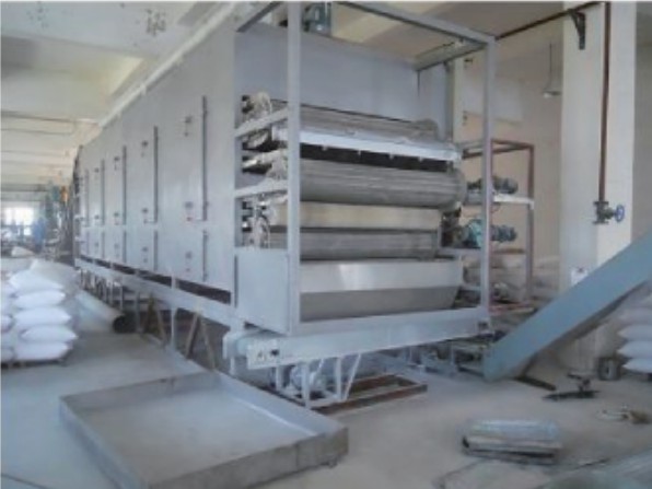 物料由加料器均匀地铺在网带上,网带-般采用12--60目不锈钢丝网,由传动装置拖动在干燥机内移动。干燥机由若干单元组成,每一单元热风独立循环,部分尾气由专门排湿风机排出,废气由调节阀控制,热气由下往上或由上往下穿过铺满物料的网带完成热量与质量传递的进程,带走物料水份。网带缓慢移动,运行速度可根据物料温度自由调节,干燥后的成品连续落入收料器中。上下循环单元根据用户需要可灵活配备,单元数量亦可根据需要选取。